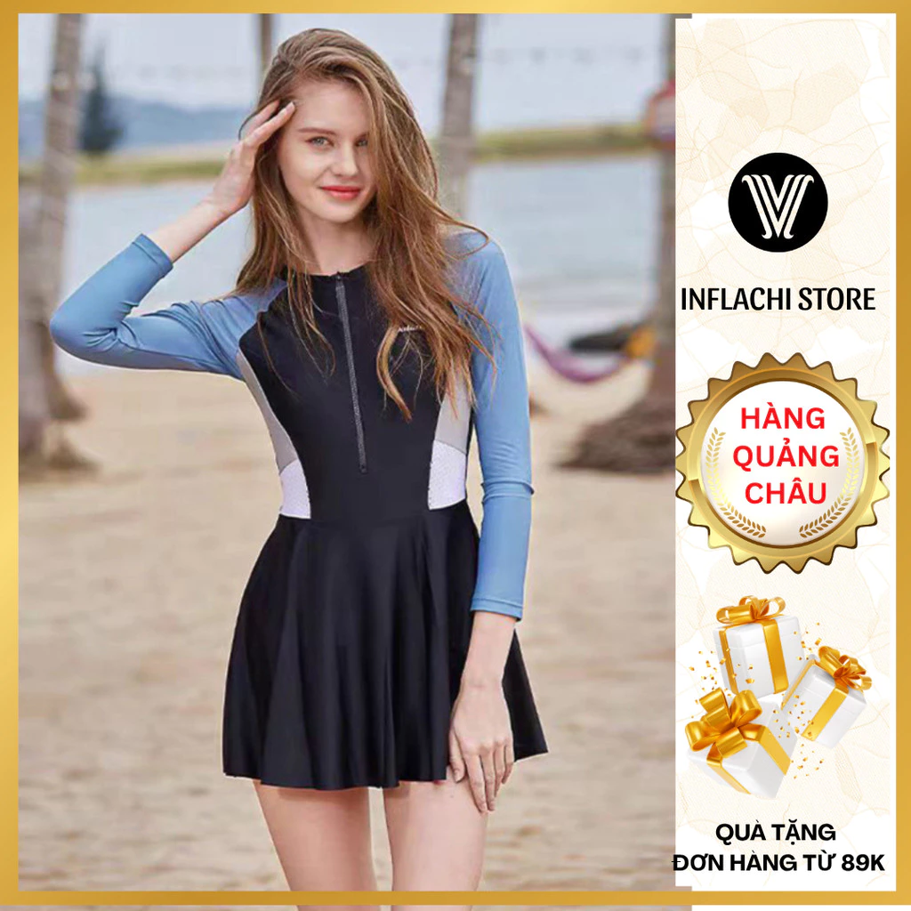 🔥 Đồ bơi nữ INFLACHI tay dài liền thân dáng váy che bụng phối màu sang chảnh đi bơi đi biển 045 G-1 đang giảm giá!
