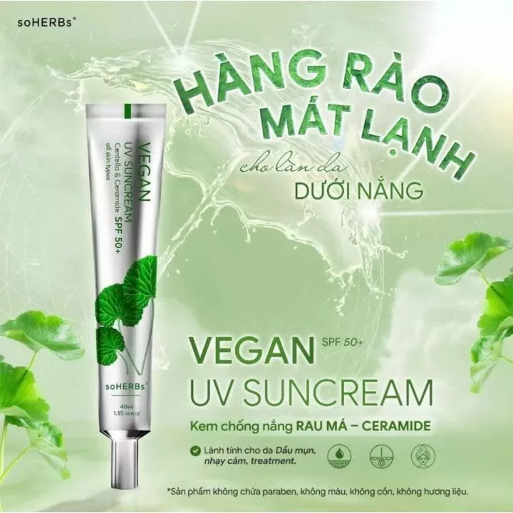 Kem Chống Nắng Rau Má soHERBs VEGAN UV SUNCREAM SPF 50+ thuộc nhóm kem chống nắng vật lý, cung cấp khả năng bảo vệ da hiệu quả và không gây kích ứng.