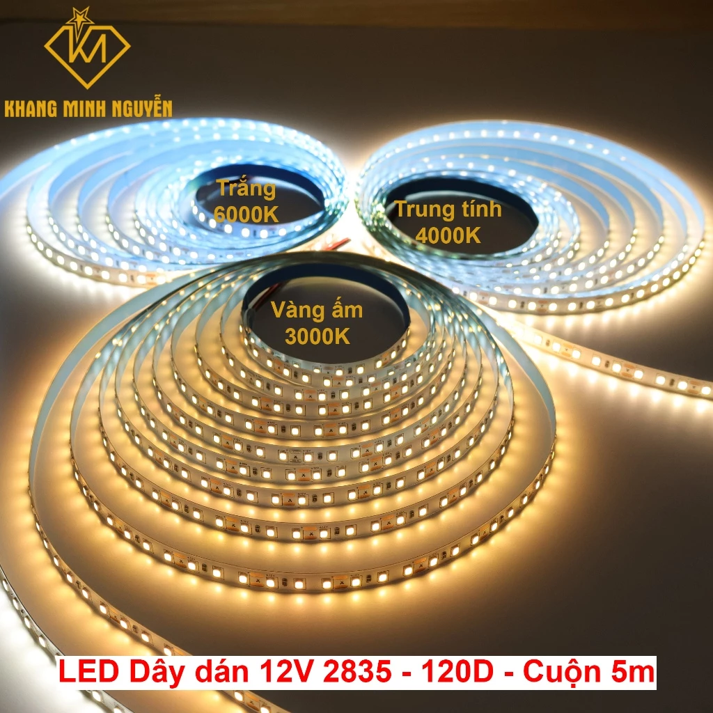 Cuộn 5m) 120 Led/mét Đèn LED dây dán 12V 2835 – có keo – màu trắng – vàng – trung tính