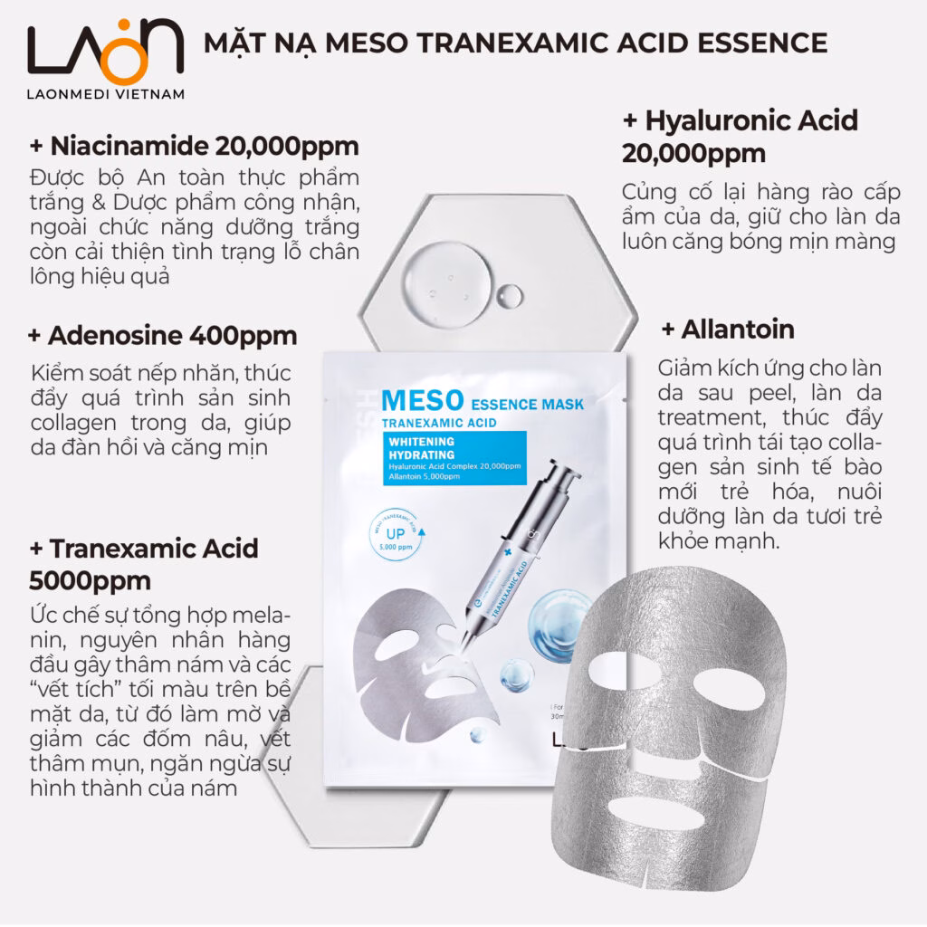 Mặt nạ bạc LAONMEDI chứa Meso Tranexamic Acid, một phiên bản cải tiến của Tranexamic Acid, giúp tăng cường hiệu quả trong việc giảm thâm nám và điều trị mụn. Ngoài ra, sản phẩm còn chứa các thành phần dưỡng da giúp mềm mịn và sáng khỏe.